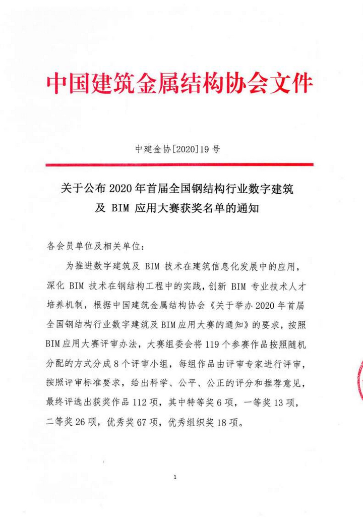 由中國建筑金屬結(jié)構(gòu)協(xié)會主辦的《2020年首屆全國鋼結(jié)構(gòu)行業(yè)數(shù)字建筑及BIM應(yīng)用大賽》評審結(jié)果于2020年9月15日揭曉。我公司由張睿、高華鵬、楊闖、徐敬文、張帝組成的BIM團(tuán)隊提交的參賽項目《潤邦達(dá)美汽車制造業(yè)供應(yīng)鏈產(chǎn)業(yè)園項目(一期)》斬獲大賽優(yōu)秀獎。