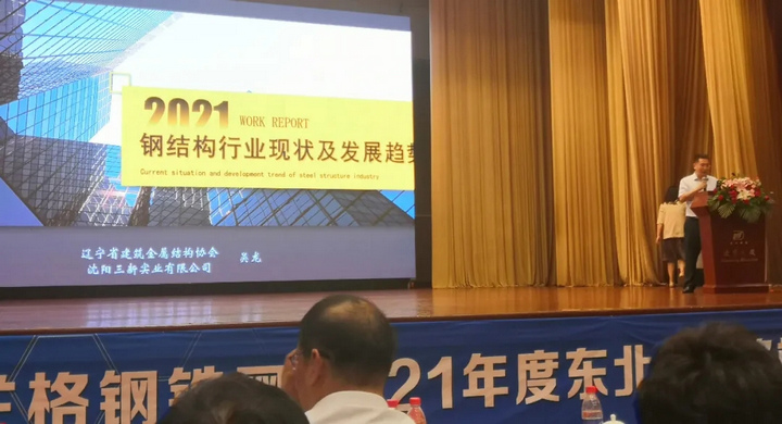 在主題演講環(huán)節(jié),三新集團(tuán)副總經(jīng)理兼遼寧省建筑金屬結(jié)構(gòu)協(xié)會(huì)副秘書(shū)長(zhǎng)吳龍就“2021鋼結(jié)構(gòu)行業(yè)現(xiàn)狀及發(fā)展趨勢(shì)”發(fā)表了精彩演講。他從建筑鋼結(jié)構(gòu)企業(yè)區(qū)域分布,遼寧地區(qū)鋼結(jié)構(gòu)行業(yè)現(xiàn)狀和發(fā)展趨勢(shì)等方面進(jìn)行了詳細(xì)介紹。