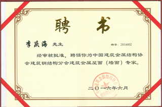 近日獲悉,我公司總工程師李慶海被聘為中國(guó)建筑金屬結(jié)構(gòu)協(xié)會(huì)鋼結(jié)構(gòu)分會(huì)建筑金屬墻面(屋面)專家。